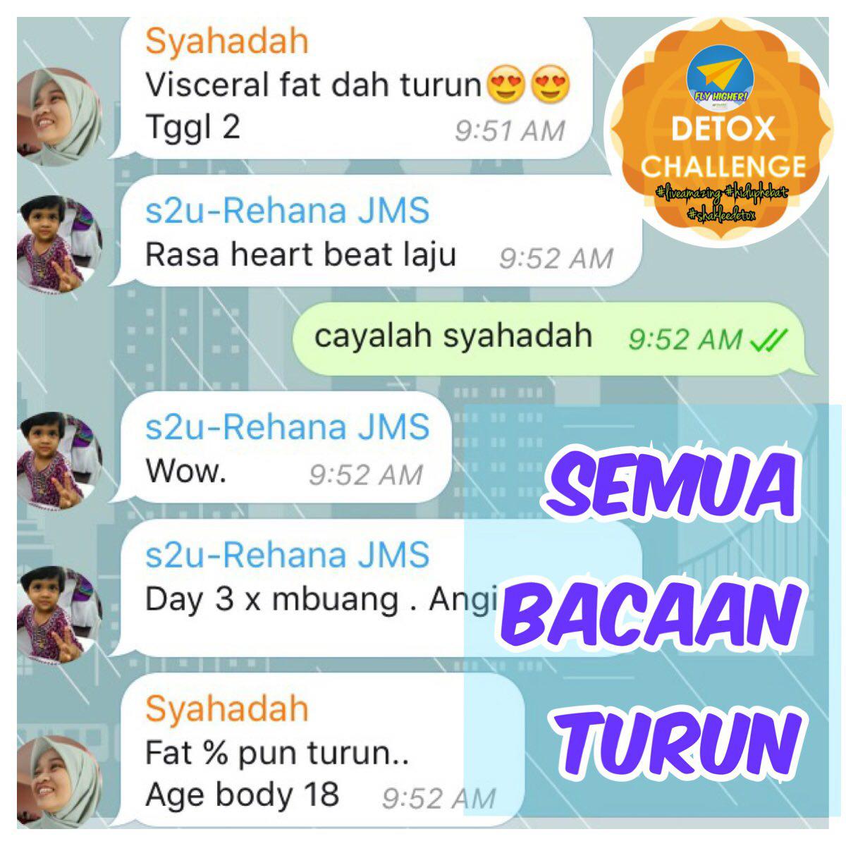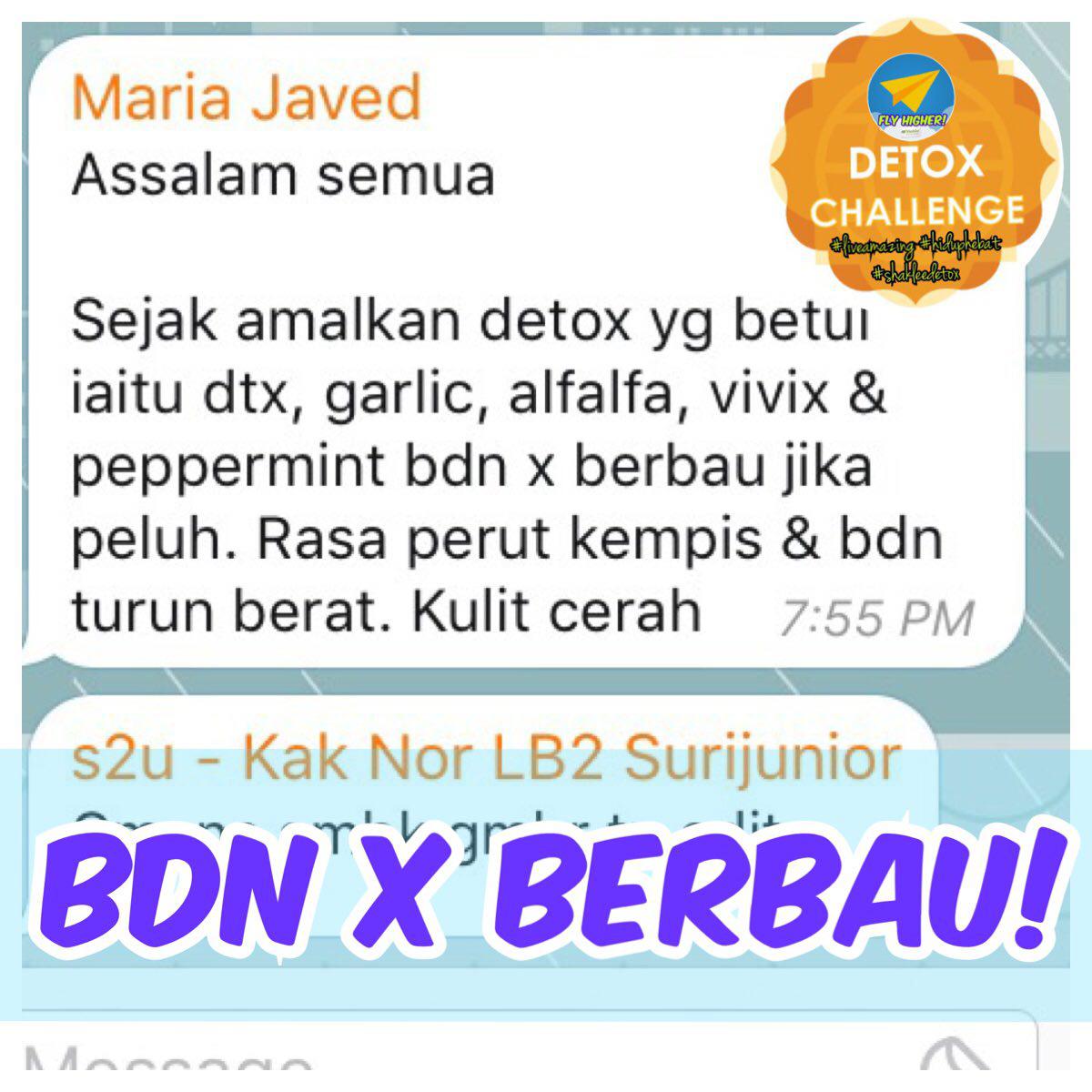 “Nak share, saya ada gastrik. Saya positif nak follow plan detox. Semalam 1st day, ok, tak pening sangat, lapar pun tak sangat. Alhamdulillah, gastrik tidak datang pun, kenyang rasa. Pagi siap zumba, tidak mudah semput.” Mukminah Min.