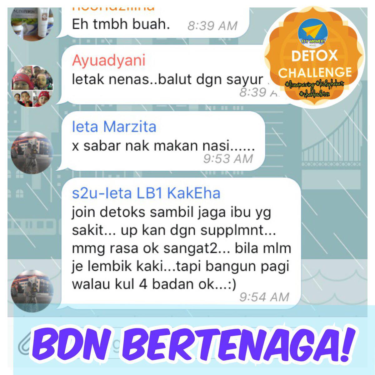 “Join detox sambil jaga ibu yang sakit. Upkan suplemen, memang rasa ok sangat. Bila malam je lembik kaki, tapi bangun pagi walau jam 4 pagi badan ok.” Kak Eha.