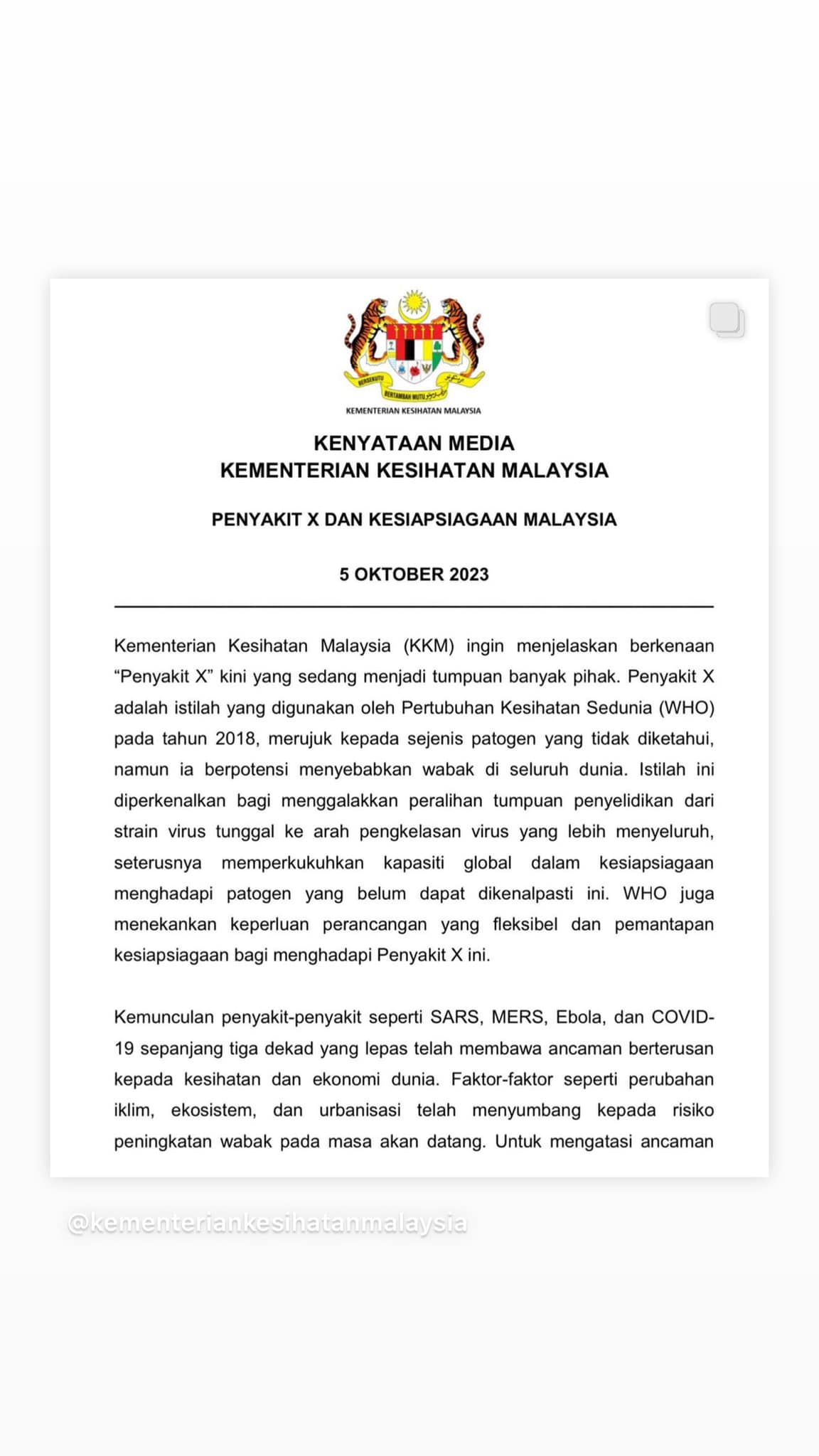 Bertarikh 5 Oktober baru-baru ini Kementerian Kesihatan Malaysia telah memberikan kenyataan berhubung sejenis wabak yang tidak diketahui, namun hanya dirujuk sebagai wabak X. Dalam satu kenyataan KKM menyebut wabak tersebut mempunyai kadar potensi mudah tersebar seperti virus campak, dan mempunyai potensi menyebabkan kematian seperti wabak ebola.
